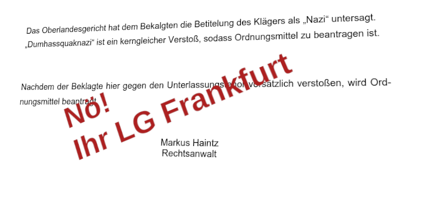 Soweit dann zu seinen öffentlichen Geblöke, dass ich ihn nicht „Nazi” nennen dürfe. Das hat übrigens auch der Anwalt Markus Haintz (Köln) behauptet und ich frage mich, was der wohl taugt und ob der seinen Mandant abzockt, statt ihn angemessen zu beraten. Denn im Ordnungsmittelantrag wurde allen Ernstes die auch öffentlich getätigte, unwahre Behauptung des Andreas Skrziepietz wiederholt, das OLG Hannover habe mir verboten, ihn einen „Nazi“ zu nennen: