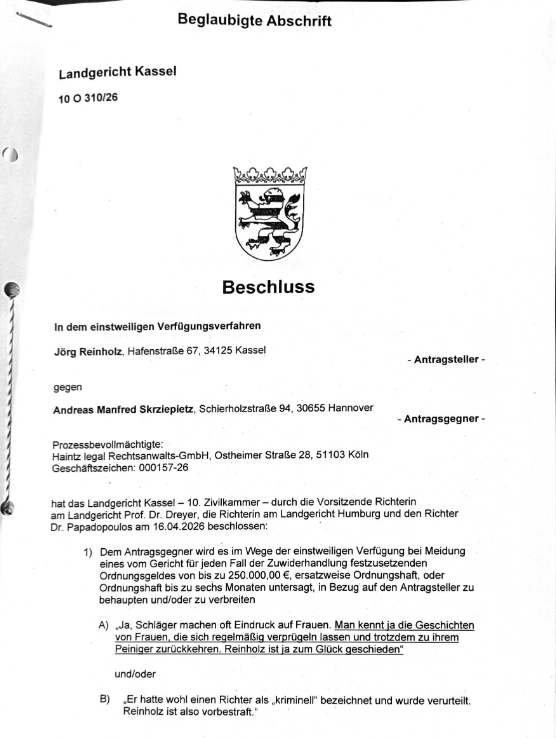 Landgericht Kassel erlässt 6. einstweilige Verfügung gegen „Dr. Rufmord“ Andreas Skrziepietz (Hannover)