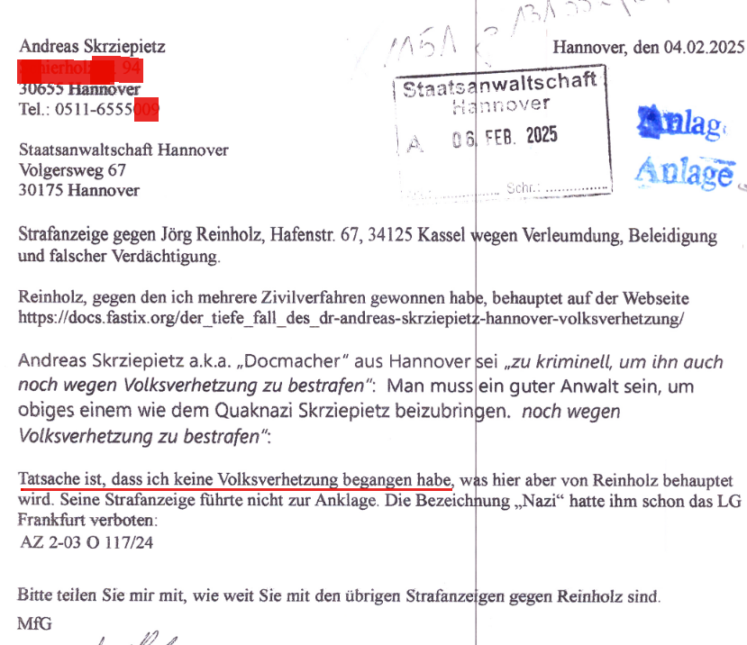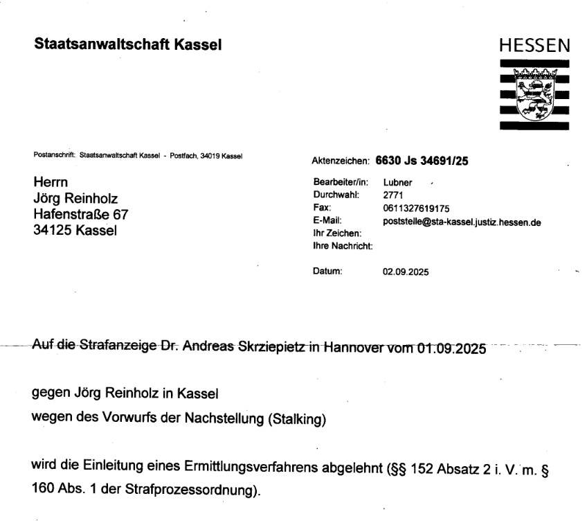 Die Staatsanwaltschaft Hannover hat mir das Aktenzeichen zum Ermittlungsverfahren wegen falscher Verdächtigung gegen Dr. „Krasshirn“ Andreas Manfred Skrziepietz aus Hannover mitgeteilt, was wohl regelmäßig mit der Aufnahme des Ermittlungsverfahrens verbunden ist. Die Mitteilung dürfte diese drei Fälle umfassen, meine weiteren Vorwürfe lauten also versuchte mittelbare Freiheitsberaubung und Nachstellen.
