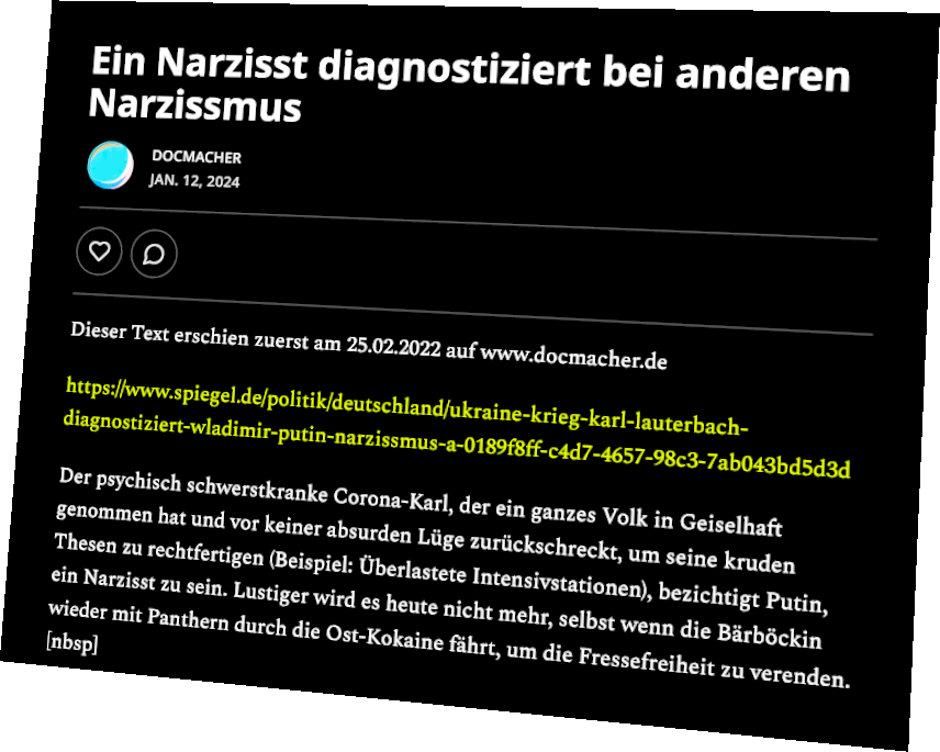 Ich denke auf Grund seines Geschreibsels (Beispiel unten) und der Vielzahl von Verurteilungen, Strafbefehlen, Anklagen sowie Ermittlungsverfahren, dass Andreas Manfred Skrziepietz (a.k.a. „Docmacher“) dissozial/narzistisch gestört ist. Und im Hinblick auf seine Äußerungen über eine „Merkel-SAntifa“ denke ich, dass seine Gedankenwelt erheblich paranoide Züge aufweist: