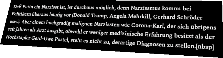 Er kann und sollte sich selbst neurologisch/psychiatrisch/sozialpädagogisch untersuchen und behandeln lassen, denn sein Verhalten weist auf eine mögliche Schädigung des Frontallappens hin. Das ist die Wahrheit, die der sich „für gar klug“ haltende „Supernarzisst“ just auf Grund der von ihm selbst (freilich unter der auffallend vielen gegenüber und zudem auffallend häufig getätigten Behauptung, just viele der von ihm dummdreist verleumdeten oder krass beleidigten wären die „Irren“, „Narzissten“ und dergleichen) öffentlich und offensichtlich gezeigten Störungen nicht verträgt.