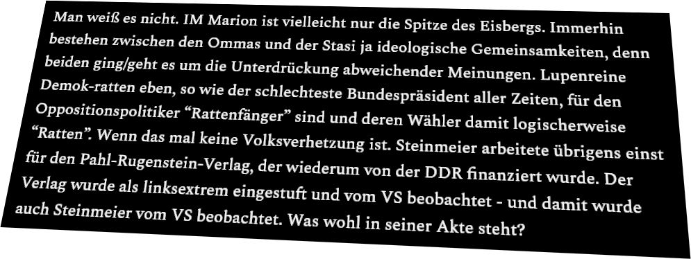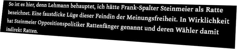 „Lupenreine Demok-ratten eben, so wie der schlechteste Bundespräsident aller Zeiten, für den Oppositionspolitiker “Rattenfänger” sind und deren Wähler damit logischerweise “Ratten”. Wenn das mal keine Volksverhetzung ist. Steinmeier ...“